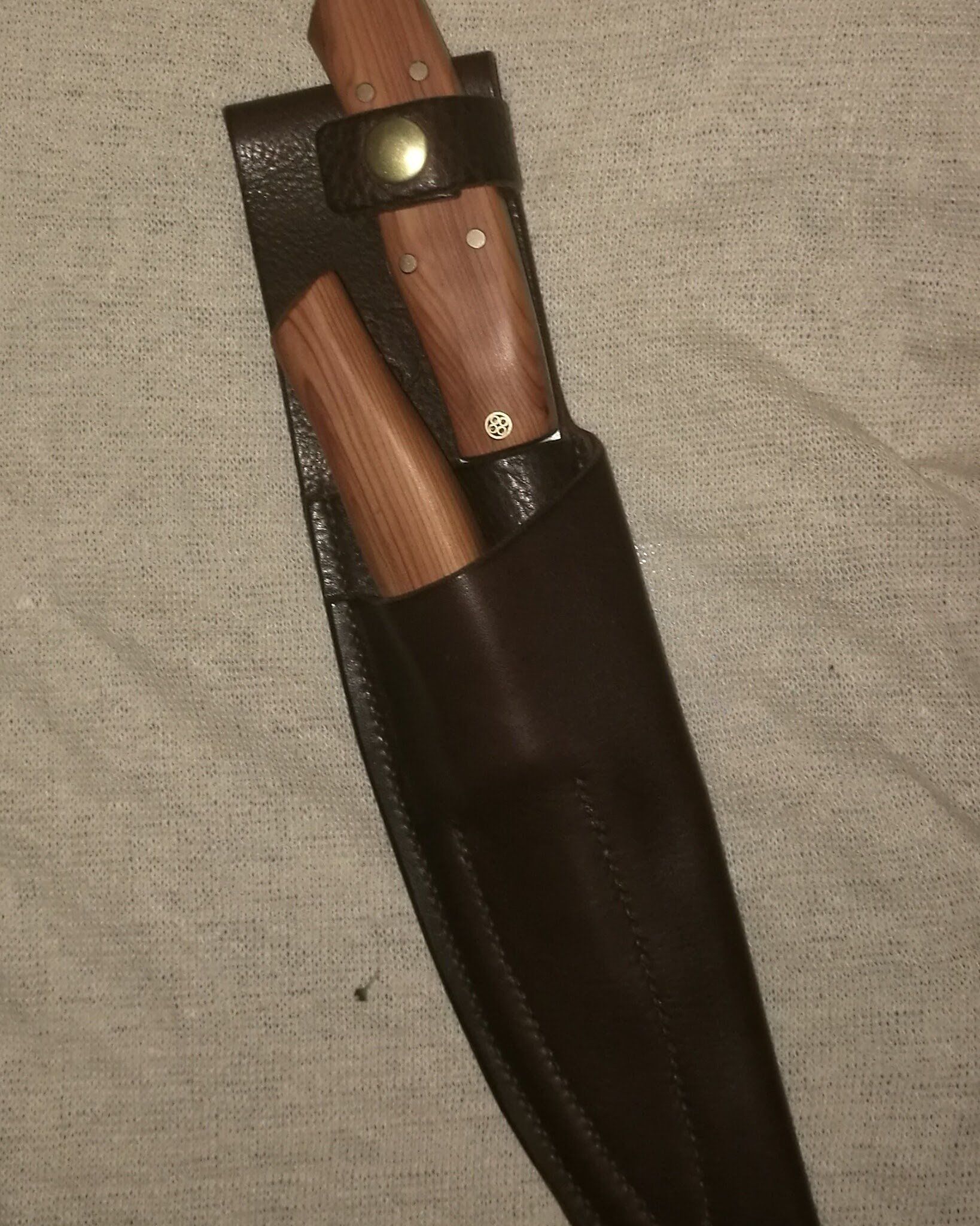 My Herne's Knives come with a sheath or sleeve made with the same 'feeling' I try to give the knives. These are beautifully hand stitched and crafted with vegetable tanned leather by Mark Papworth at White Buffalo Crafts.